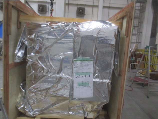 图一 大型装置做包装防护 图二 进行防水和木框包装